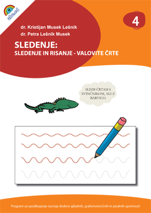 O sledenju Sledenje je pomembna aktivnost pri spodbujanju koordinacije oko - roka. Ko s svinčnikom ali drugim risalom sledi narisani predlogi, otrok s pogledom sproti primerja napredujočo risbo z osnovno predlogo. Pri tem se utrjuje nadzor nad drobnimi gibi roke s katerimi otrok nadzira gibanje piosala in se krepi vizualno motorična integracija. Naloge sledenja so pomembne za pridobivanje spretnosti, ki igrajo pomembno vlogo pri razvoju pisanja, risanja in drugih drobno gibalnih spretnosti. Med risanjem oziroma sledenjem predlogam naj otrok ne spreminja položaja lista in naj ga ne obrača. Če je le mogoče, naj poskusi risati posamezen lik v eni potezi, brez ustavljanja ali prestavljanja pisala. Delovni listi in dejavnosti v tem delovnem zvezku Naloge v tem delovnem zvezku so načrtovane tako, da otrok s sledenjem različno dolgim ravnim in vijugastim črtam utrjuje grafomotorične spretnosti. Predložene črte so začrtane z nizom pikic ali črtic, ki jim mora otrok slediti med risanjem. Težavnost nalog v delovnem zvezku se stopnjuje v več smereh: