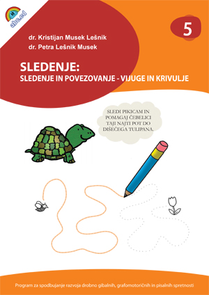 O sledenju Sledenje je pomembna aktivnost pri spodbujanju koordinacije oko - roka. Ko s svinčnikom ali drugim risalom sledi narisani predlogi, otrok s pogledom sproti primerja napredujočo risbo z osnovno predlogo. Pri tem se utrjuje nadzor nad drobnimi gibi roke s katerimi otrok nadzira gibanje piosala in se krepi vizualno motorična integracija. Naloge sledenja so pomembne za pridobivanje spretnosti, ki igrajo pomembno vlogo pri razvoju pisanja, risanja in drugih drobno gibalnih spretnosti. Med risanjem oziroma sledenjem predlogam naj otrok ne spreminja položaja lista in naj ga ne obrača. Če je le mogoče, naj poskusi risati posamezen lik v eni potezi, brez ustavljanja ali prestavljanja pisala. Delovni listi in dejavnosti v tem delovnem zvezku Naloge v tem delovnem zvezku so načrtovane tako, da otrok s sledenjem različnim vijugastim črtam utrjuje grafomotorične spretnosti. Predložene črte so začrtane z nizom pikic, ki jim mora otrok slediti med risanjem. Težavnost nalog v delovnem zvezku se stopnjuje v treh smereh: