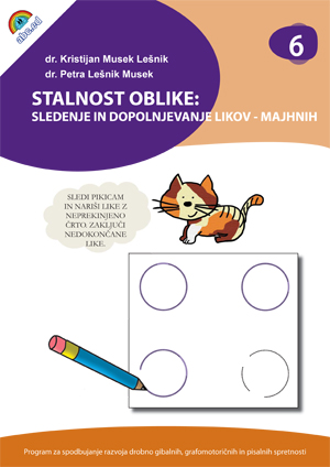 O sledenju in dopolnjevanju Sledenje narisanim črtam je pomembna dejavnost pri spodbujanju koordinacije oko - roka. Ko otrok čim bolj natančno sledi risbi, mora s pogledom sproti slediti napredujoči črti in njeno smer primerjati ter jo po potrebi prilagajati narisani predlogi; pri dopolnjevanju manjkajočih delov risbe mora nastajajočo risbo primerjati s popolno risbo lika. Med risanjem se krepi nadzor nad drobnimi gibi roke s katerimi otrok nadzira gibanje pisala med sledenjem predlogi in dopolnjevanjem manjkajočih delov risbe. Med risanjem naj otrok ne spreminja položaja lista in naj ga ne obrača. Če je le mogoče, naj poskusi risati v eni potezi, brez ustavljanja, ali prestavljanja pisala. Delovni listi in dejavnosti v tem delovnem zvezku Naloge v delovnem zvezku so načrtovane tako, da spodbujajo otrokovo vizualno motorično integracijo preko sledenja in dopolnjevanja večjih likov. Težavnost nalog v delovnem zvezku se stopnjuje v več smereh: