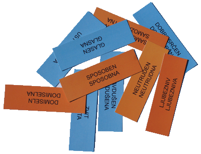 Nekatere besede so otrokom in mlajšim najstnikom bolj poznane, nekatere manj. Nekatere besede, ki označujejo osebne poteze in lastnosti, vključene v komplet za starost nad 10 let, so lahko abstraktne in zato nekaterim otrokom manj razumljive. En od namenov kompleta je širjenje besednjaka in razumevanja različnih osebnih potez in lastnosti. Cilj dejavnosti ni podajanje “pravih” odgovorov, pač pa spodbujanje samospoznavanja, razmišljanja o sebi in o drugih in razmišljanja o pomenu osebnih lastnosti in potez, ki jih ljudje izražajo s svojimi ravnanji in odločitvami. Komplet omogoča različne dejavnosti v večjih skupinah (razred), manjših skupinah, ali pa individualno delo s posameznim otrokom. Vsebina kompleta
