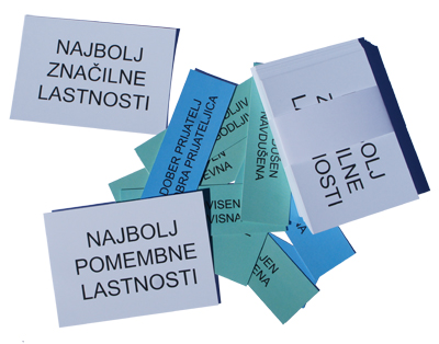 Nekatere besede so najstnikom bolj poznane, nekatere manj. En od namenov kompleta je širjenje besednjaka in razumevanja različnih osebnih potez in lastnosti. Cilj dejavnosti ni podajanje “pravih” odgovorov, pač pa spodbujanje samospoznavanja, razmišljanja o sebi in o drugih in razmišljanja o pomenu osebnih lastnosti in potez, ki jih ljudje izražajo s svojimi ravnanji in odločitvami. Komplet omogoča različne dejavnosti v večjih skupinah (razred), manjših skupinah, ali pa individualno delo s posameznim otrokom. Vsebina kompleta